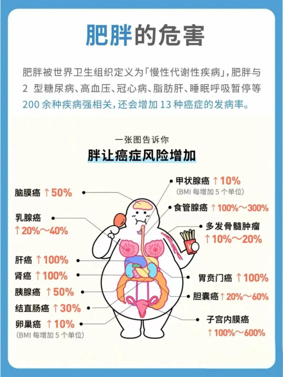 肥胖已成为第六大致死致残的危险因素。国家明确指出,肥胖不是简单的审美问题,而是严峻的公共卫生挑战。肥胖对我们健康危害巨大,它会影响我们心脏、血管、肝脏、胰腺胰岛素抵抗、肾脏胰腺肾小球“三高”、骨关节等等...