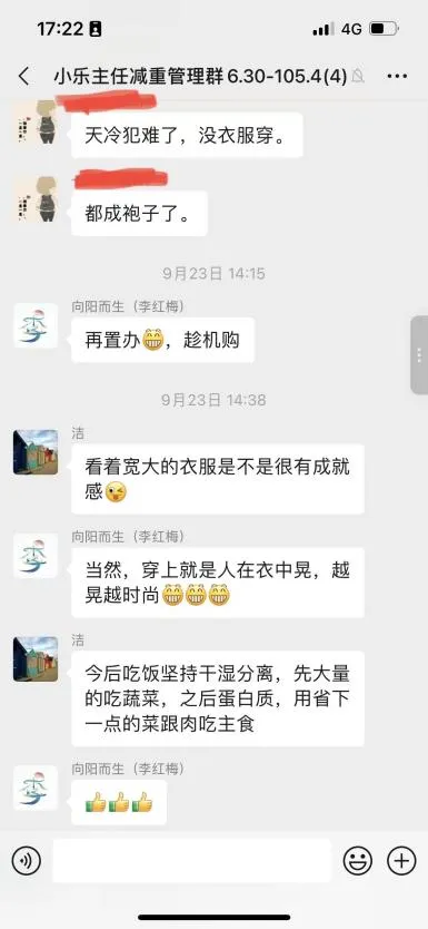 每2周1次线下复诊,建立专属健康管理群,随时解答饮食、运动疑问,比如“聚餐怎么吃不胖”“膝盖不好能做什么运动”,避免学员“孤军奋战”。在群中,专家们进行多对一管理,及时解答疑问,指导患者如何选择及掌握量。