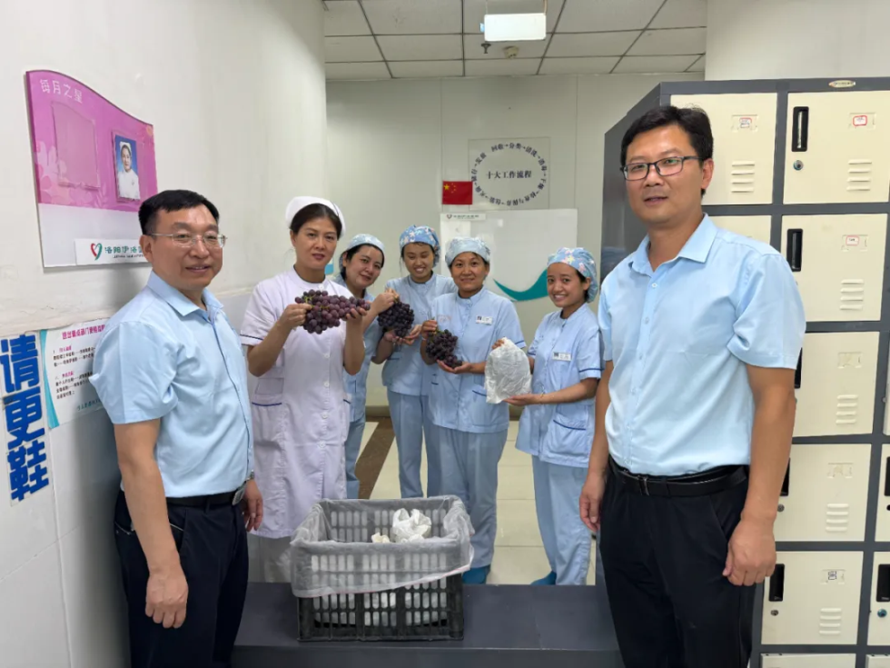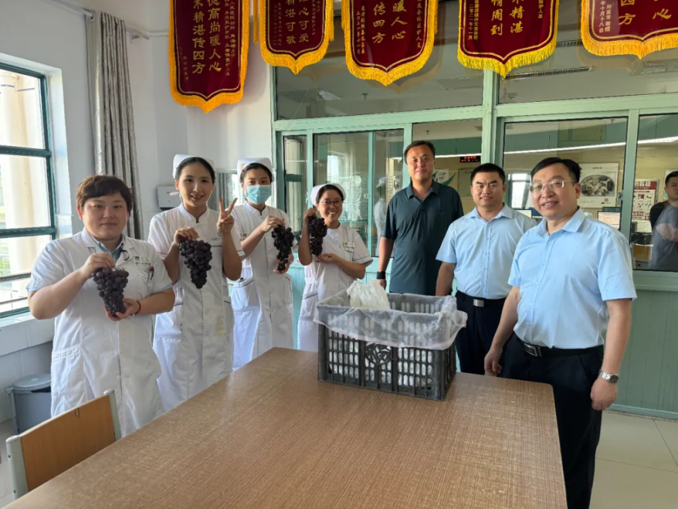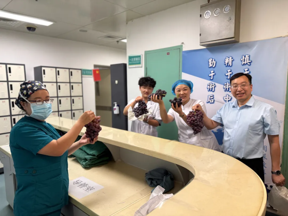“大家辛苦了!天气热,注意防暑,保重身体!”每到一处,院领导都与在岗职工亲切交谈,叮嘱大家在做好患者服务的同时,务必做好自我防护,合理调整休息。一串串饱满多汁的葡萄被递到职工手中,清甜的果香驱散了夏日的燥热,也让大家的脸上露出了欣慰的笑容。