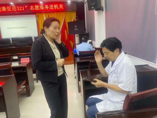 9月25日上午,在我院党委副书记苑高飞的带领下,我院卒中胸痛急救培训团队来到龙门街道办事处开展“健康促进321”志愿服务活动,为机关负责人及辖区村委干部60余人培训急救知识。