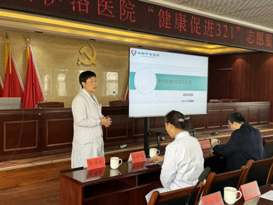 培训现场,脑血管病科副主任及脑三科主任常伟东讲授《脑卒中的识别与预防》;心内一科副主任韩艳艳讲授《急性胸痛的识别与处理》;健康管理中心主任李红梅讲授《心肺复苏术技能培训》。