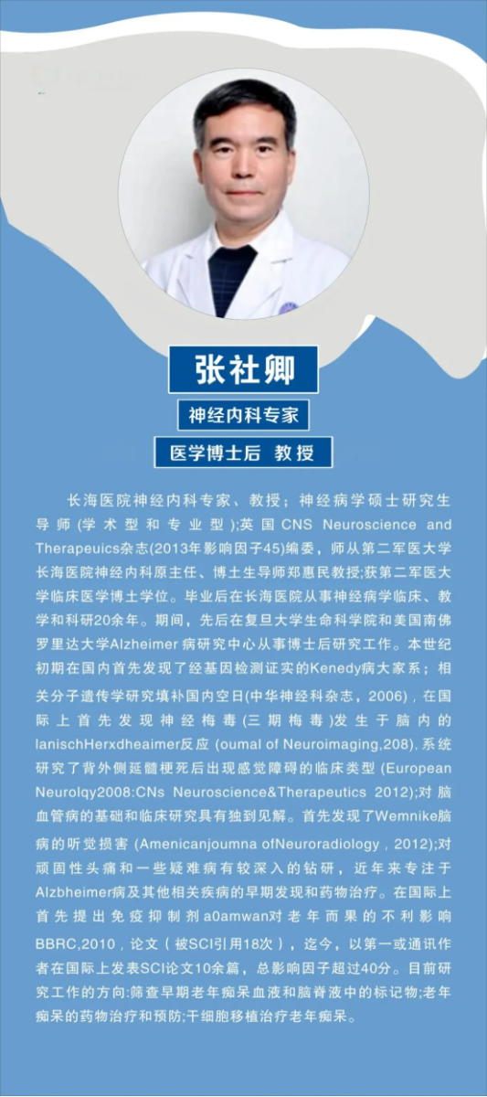 张社卿教授,上海长海医院神经内科教授,神经病学博士后,对各种神经系统和脑血管病的诊治有较丰富的临床经验和机制研究。擅长头痛、头晕、失眠、认知记忆障碍(包括老年痴呆等)、青年人中风和各种神经系统疑难病的诊治。