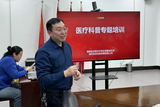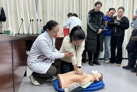 1月23日下午,在院党委副书记苑高飞的带领下,我院急救科普培训团队来到了洛阳经济技术开发区管委会开展“健康促进321”志愿服务活动,为40余名基层干部和企业代表培训卒中识别、胸痛识别、癌症预防与筛查、心肺复苏术等急救科普知识。