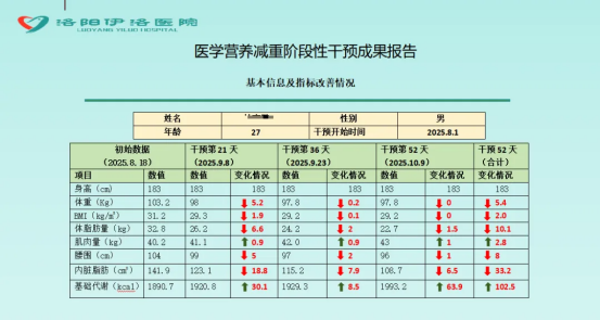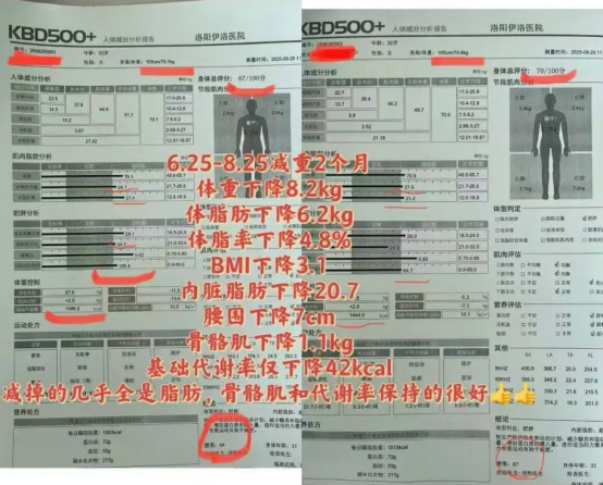 减重52天,体重降低5.2kg,其中体脂肪下降10.1kg,内脏脂肪下降33.2cm2,腰围下降8cm,骨骼肌增加2.8kg,基础代谢率增加102.5kcal,真正做到了减脂增肌!