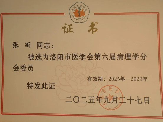 9月27日上午,在刚刚结束的洛阳市医学会病理学分会第六届委员会换届选举会议上,我院病理科凭借在区域病理诊断领域的专业实力、学术影响力及行业认可度,成功当选为洛阳市医学会病理学分会第六届常委秘书单位,科室主任魏志豪当选分会常委并兼任秘书,病理科医师张雨当选分会委员。