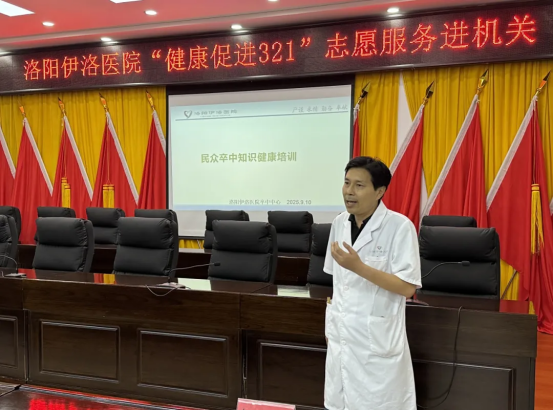 9月25日上午,在我院党委副书记苑高飞的带领下,我院卒中胸痛急救培训团队来到龙门街道办事处开展“健康促进321”志愿服务活动,为机关负责人及辖区村委干部60余人培训急救知识。