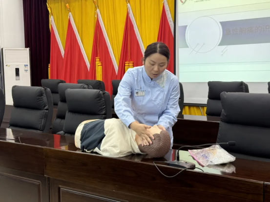 活动现场,脑五科主任杨亚军带来《民众卒中知识健康培训》,心内一科副主任韩艳艳带来《急性胸痛的识别及处理》,健康管理师杨梅洁讲解演示《心肺复苏术》,现场学习氛围热烈有序。