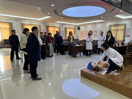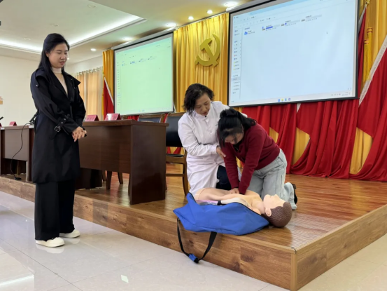 培训现场,脑科系主任司玲珍、心内二科及CCU副主任刘飞飞、病理科主任魏志豪、健康管理中心主任李红梅分别授课卒中、胸痛、防癌、心肺复苏术等知识技能,博得了在场人员的阵阵掌声。