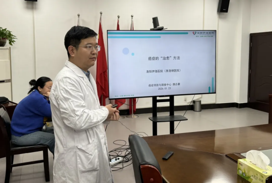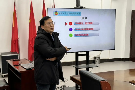 1月23日下午,在院党委副书记苑高飞的带领下,我院急救科普培训团队来到了洛阳经济技术开发区管委会开展“健康促进321”志愿服务活动,为40余名基层干部和企业代表培训卒中识别、胸痛识别、癌症预防与筛查、心肺复苏术等急救科普知识。